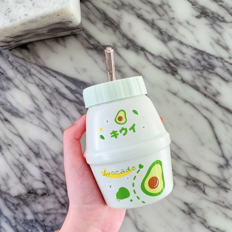 كوب سيراميك بشكل علبة عسل مع مصاصة زجاجية باللون الاخضر (الفستقي) سعة 400ملي